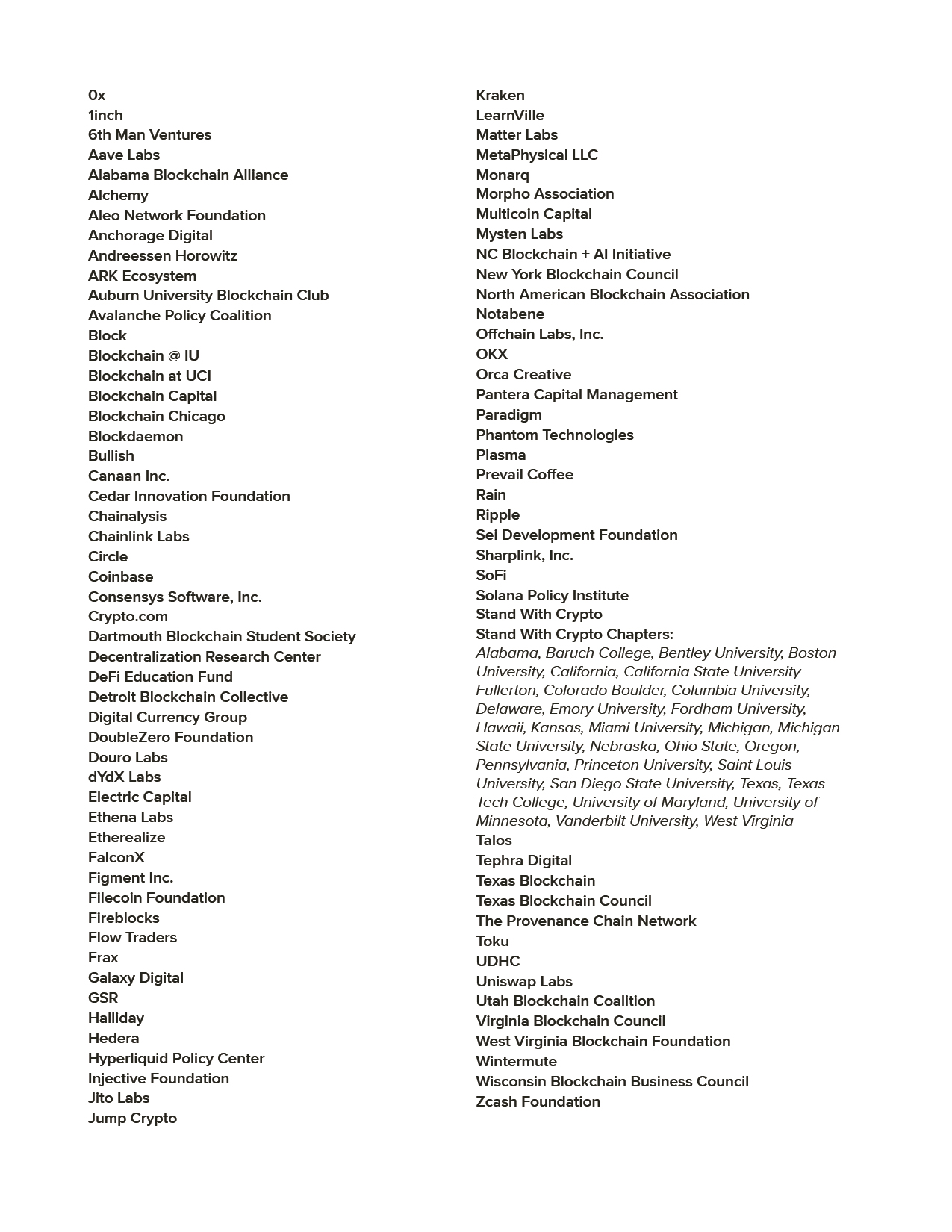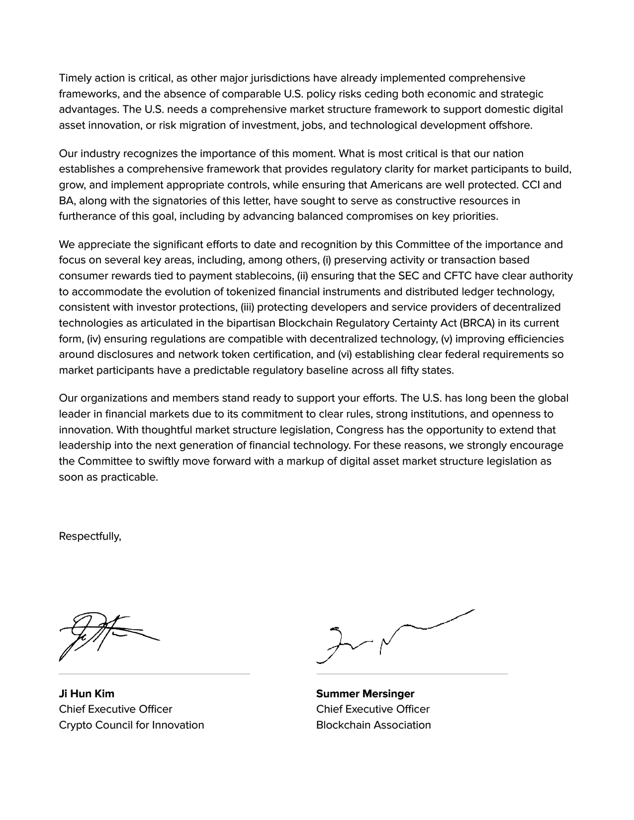Na carta, os nomes envolvidos destacam um papel de liderança dos políticos do Comitê, bem como esforços bipartidários. Da mesma forma, afirmam que os Estados Unidos não podem retornar à aplicação da lei como era exercida na gestão anterior, que, segundo eles, resultava em incerteza para construtores e participantes do mercado. Nesse sentido, a carta aponta que uma legislação de estrutura de mercado impediria a incerteza ao estabelecer limitações jurídicas claras, entre outros pontos.